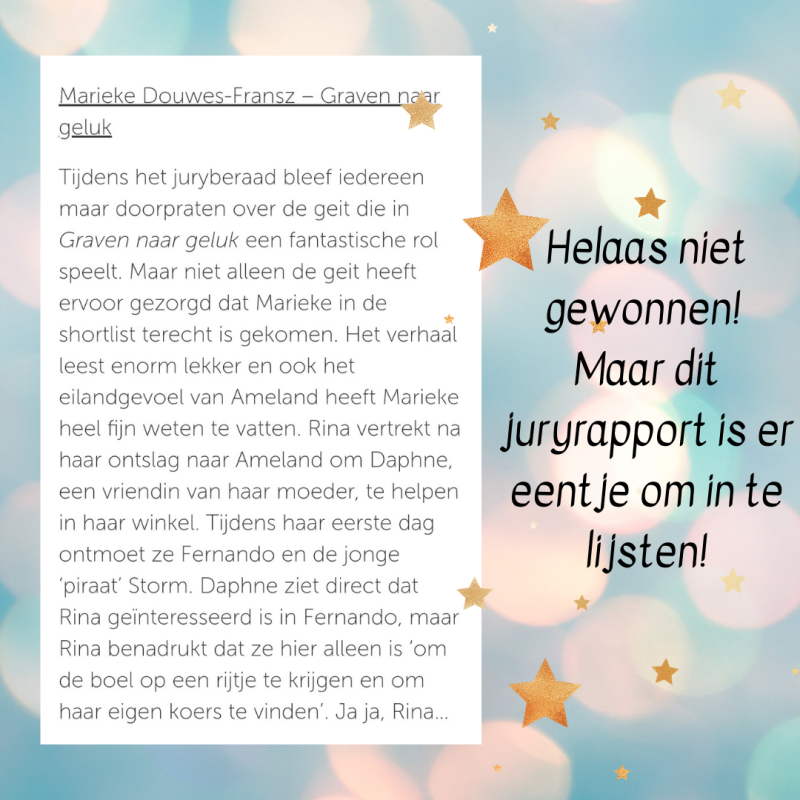 Want helaas helaas, mijn 'Graven naar Geluk' heeft het niet gered! Wel hebben alle deelnemers een mooie feedback/juryrapport gekregen maar eerlijk is eerlijk: op dit moment doet dat je weinig. Als auteur weet je immers wel hoe een afwijzing eruit ziet en hoe ze dat ook formuleren: een nee blijft een nee. En die wil je niet. Je wilt een ja!