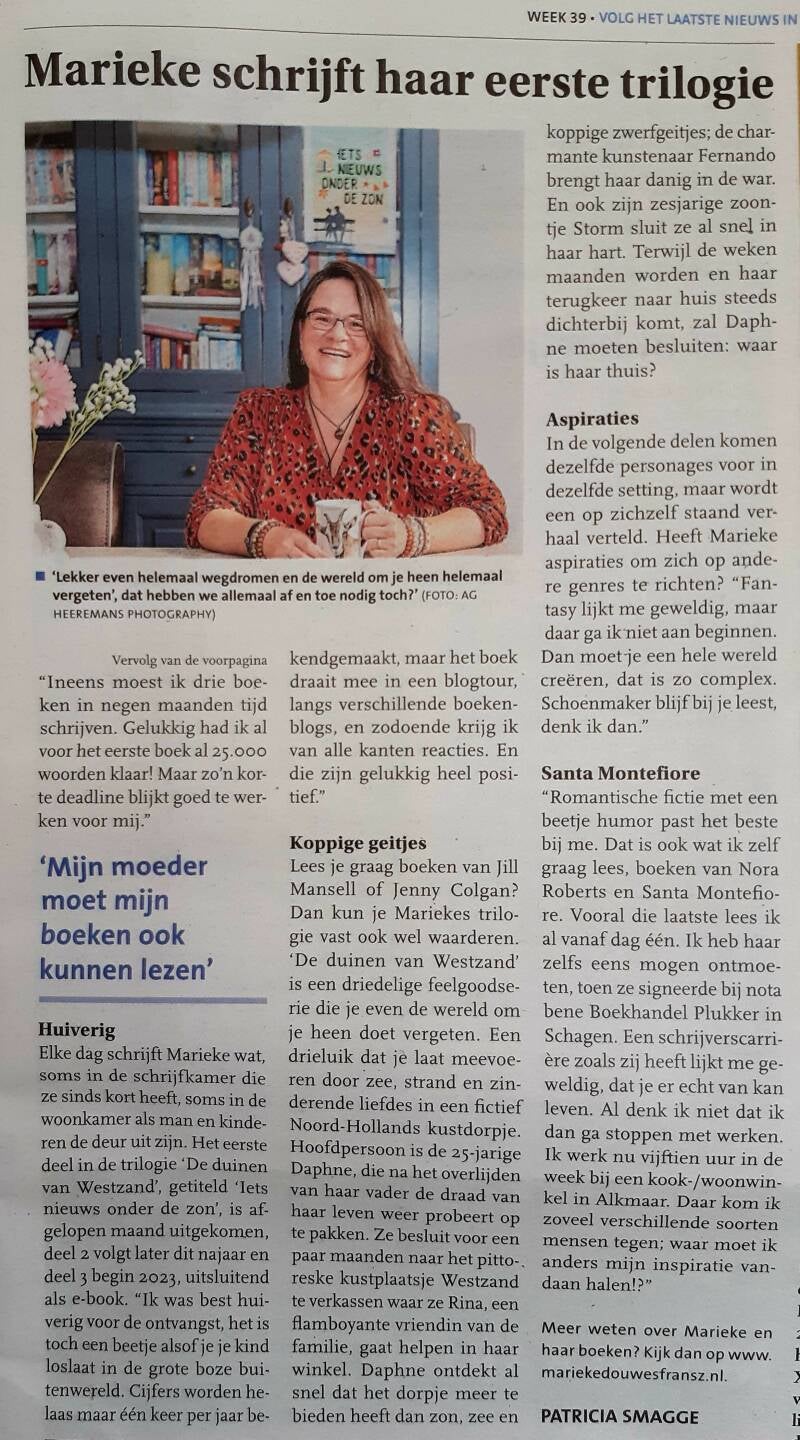 Toen ik voor de eerste keer door Patricia Smagge werd geïnterviewd, vroeg ze me met klem om haar op de hoogte te houden van mijn boekenavontuur. Natuurlijk heb ik dat graag gedaan en dus sta ik weer in de online versie van Nieuwsblad Dijk & Waard!